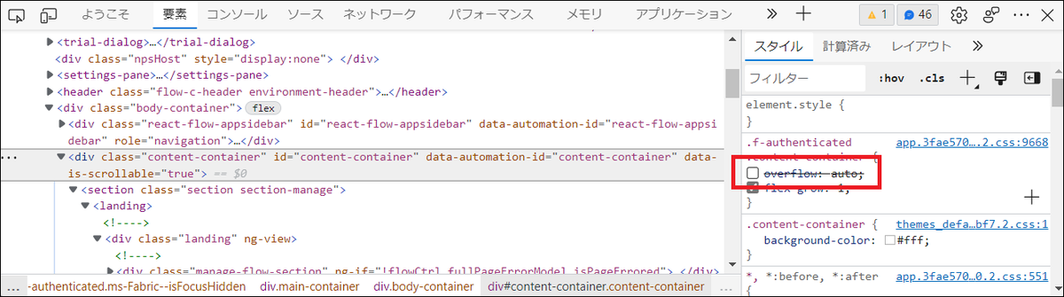 - overflow: auto; を探しチェックを外します。