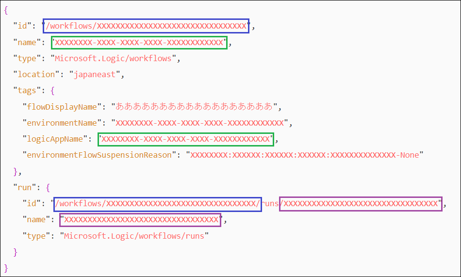 { "id": "/workflows/XXXXXXXXXXXXXXXXXXXXXXXXXXXXXXXX", "name": "XXXXXXXX-XXXX-XXXX-XXXX-XXXXXXXXXXXX", "type": "Microsoft.Logic/workflows", "location": "japaneast", "tags": { "flowDisplayName": "ああああああああああああああああああ", "environmentName": "XXXXXXXX-XXXX-XXXX-XXXX-XXXXXXXXXXXX", "logicAppName": "XXXXXXXX-XXXX-XXXX-XXXX-XXXXXXXXXXXX", "environmentFlowSuspensionReason": "XXXXXXXX:XXXXXX:XXXXXX:XXXXXX:XXXXXXXXXXXXXX-None" }, "run": { "id": "/workflows/XXXXXXXXXXXXXXXXXXXXXXXXXXXXXXXX/runs/XXXXXXXXXXXXXXXXXXXXXXXXXXXXXXXXX", "name": "XXXXXXXXXXXXXXXXXXXXXXXXXXXXXXXXX", "type": "Microsoft.Logic/workflows/runs" } }
