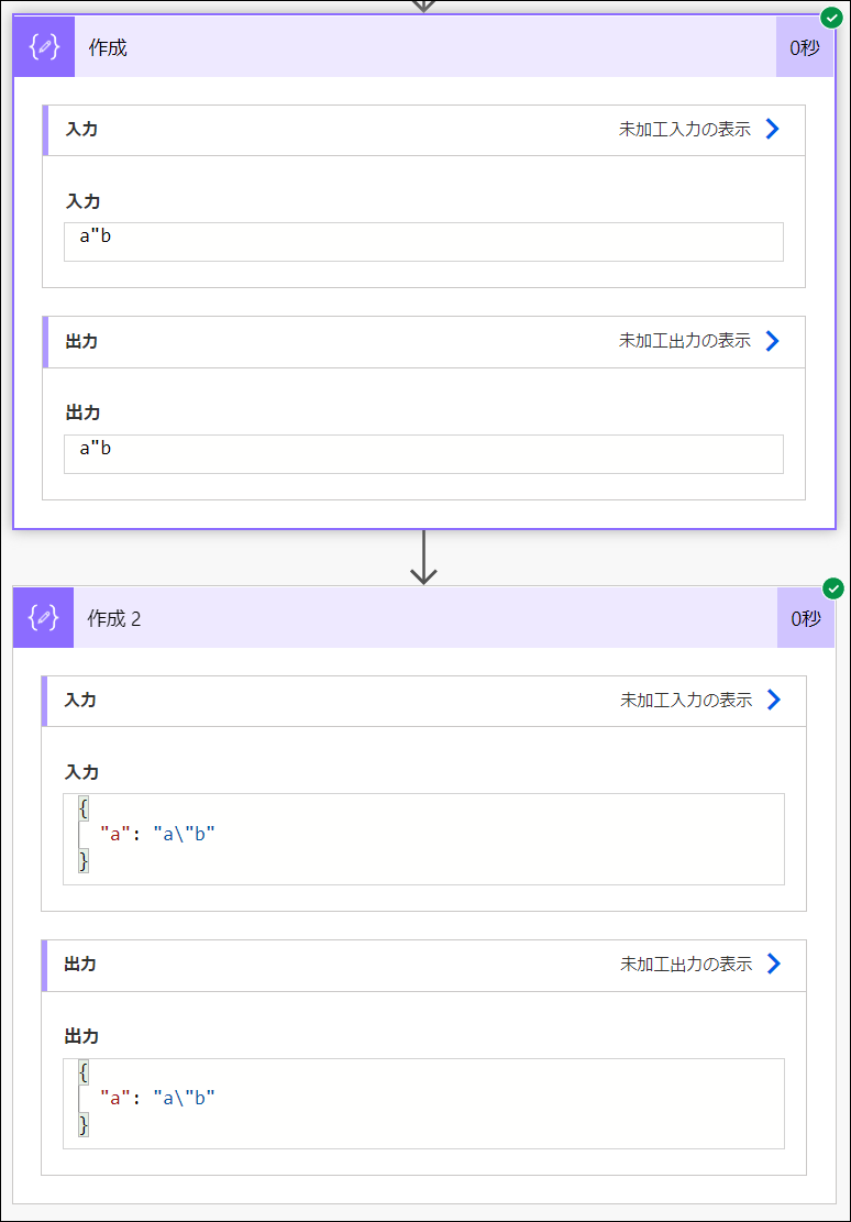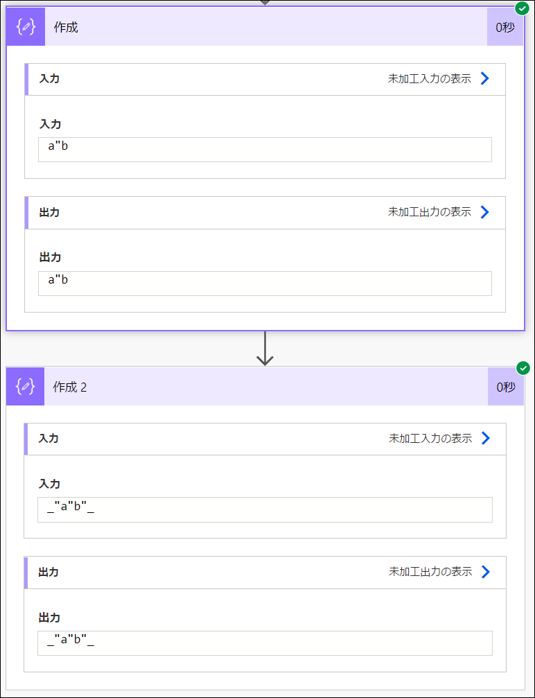まずは普通に文字列として使ってみます。" が含まれる出力を 作成 で作り 作成 2 で使ってみます。