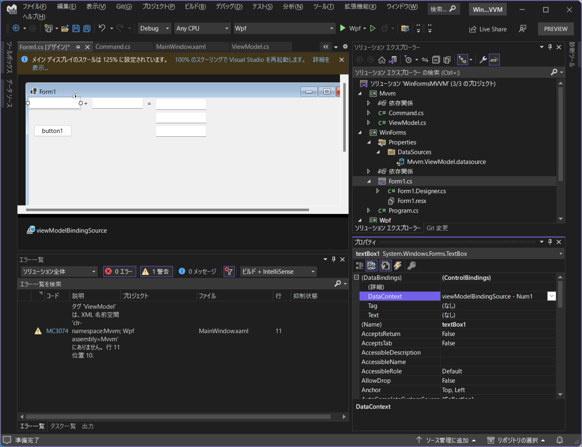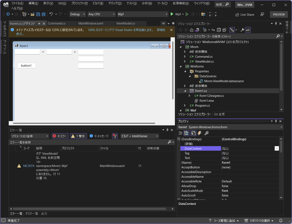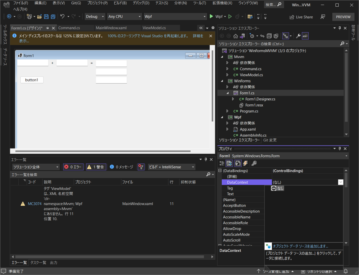ソリューションエクスプローラーでプロパティに ViewModel のクラスが生えましたが、Form の DataContext は空です。なぜ。