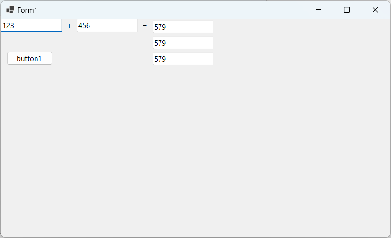 namespace WinForms; public partial class Form1 : Form { public Form1() { InitializeComponent(); this.DataContext = new Mvvm.ViewModel(); AddBinding(textBox1, "Text", "Num1"); AddBinding(textBox2, "Text", "Num2"); AddBinding(textBox3, "Text", "Num3"); AddBinding(textBox4, "Text", "Num3"); AddBinding(textBox5, "Text", "Num3"); AddBinding(button1, "Command", "Command"); static void AddBinding(Control control, string property, string dataMember) => control.DataBindings.Add(property, control.DataContext, dataMember, true); } }