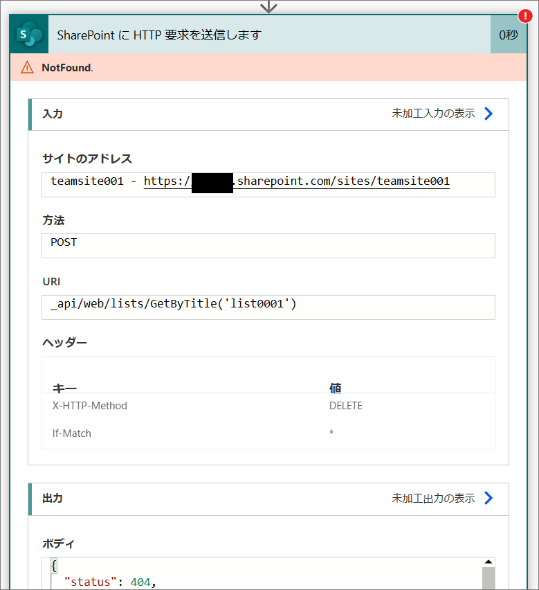 既に削除済み、未作成等、リストがない場合はこんな感じで 404 でエラーになります。